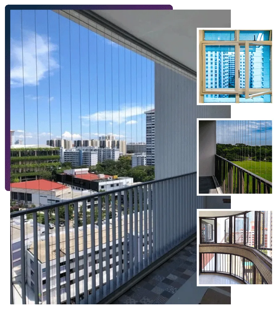 Our Invisible Grills offer a modern, elegant safety solution for balconies, windows, and open spaces—providing an unobstructed view while keeping your loved ones safe. We also specialize in Pigeon and Bird Nets, designed to prevent unwanted bird intrusion and maintain hygiene around your premises. Additionally, our Balcony Safety Nets are ideal for ensuring complete protection for children, pets, and family members from accidental falls.
